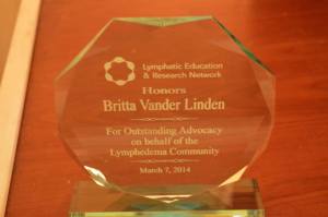 Empowering others who suffer from lymphedema is Britta’s passion. In 2014, the Lymphatic Education and Research Network, also known as LE&RN, chose Britta for its Outstanding Advocacy Award on behalf of the LE community.