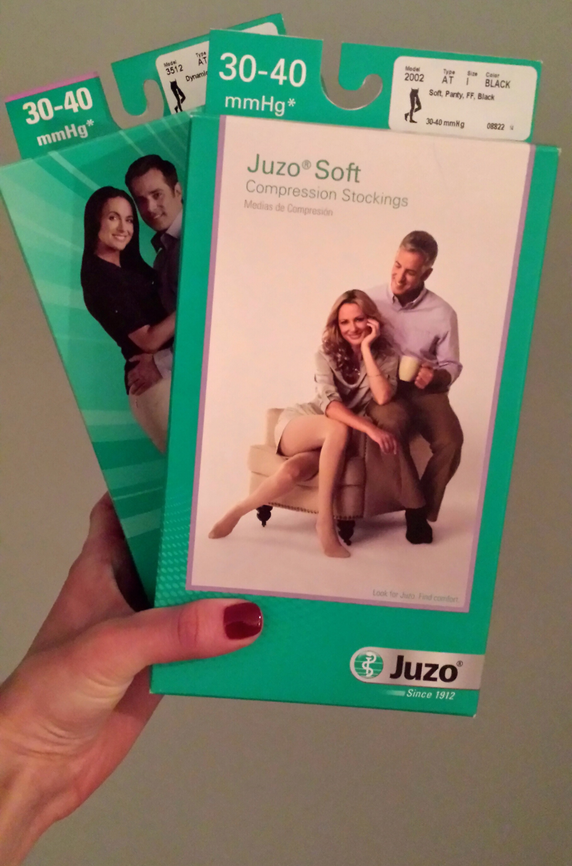 Kick your feet up. Literally. Find a chair that lifts your legs up while taking pressure off of your back. Watch a movie or read a book while compression-stocking-free.